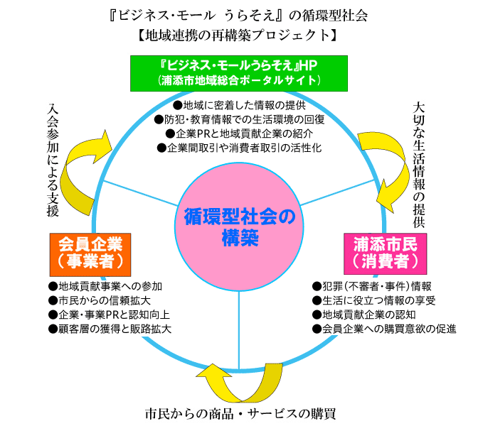 このように、市民の生活に必要な情報を網羅した内容を発信することによって、犯罪の抑止による安全な生活環境を作り、また災害を乗り越える助け合いの防災コミュニティ造りの推進、そして子ども達を伸びのびと健やかに育てることの出来る「地域連携社会の再構築」を目指しております。また、地域全体の絆となる生活に密着した、きめ細かな情報を提供することで、企業が地域に貢献(情報提供・ボランティア)し、市民が企業を支える仕組み『循環型社会』の構築を目的としております。そして、それが企業や市民・行政の情報交流の場となり、地場産業の育成、地域経済の活性化に繋がるものと考えております。