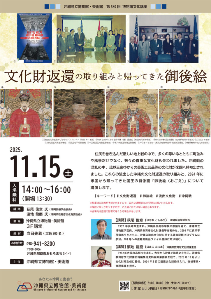 住民を巻き込んだ激しい地上戦の中で、多くの尊い命とともに町並みや風景だけでなく、数々の貴重な文化財も失われました。沖縄戦の混乱の中、琉球王家ゆかりの美術工芸品等の文化財が米国へ持ち出されました。これらの流出した沖縄の文化財返還の取り組みと、2024 年に米国から帰ってきた国王の肖像画「御後絵(おごえ)」について講演します。