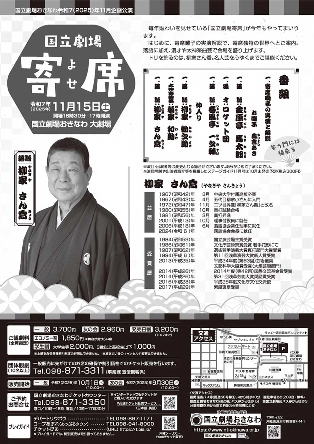 HOME > お役立ち > 娯楽 > ライブ・コンサート > 企画公演 国立劇場寄席 2025/11/15 (土) (国立劇場おきなわ)
