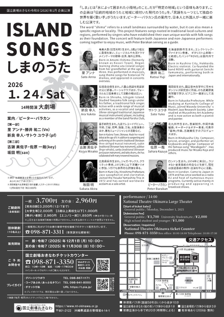 「しま」とは「水によって囲まれた小陸地」のこと。だが「特定の地域」という意味もあります。この企画は「伝統的地域のうたと地域に根付いた現代のうた」を、「民謡をルーツとして独自の世界を築く歌い手」がうたいます。ピーター・バラカン氏の案内で、日本人と外国人が一緒に楽しむ公演です。