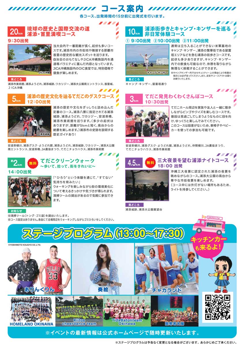 浦添や首里とJICA施設内を巡るコースをはじめ、普段入れない米軍基地キャンプ・キンザーの中を歩くコースや沖縄三大夜景に認定された浦添の夜景が楽しめるコースが楽しめます。会場内では、ステージイベントやキッチンカーの出店など、子どもから大人まで「てだこの街」が1日中楽しめるイベントとなっています。